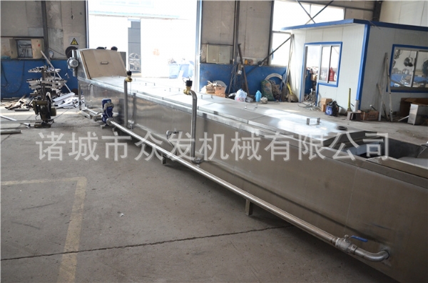 循环水泵前边加有过滤系统(采用三角网孔过滤),以防止槽内杂质抽到泵中和长时间在杀 菌(冷却)槽内循环;过滤器清理口采用无工具拆装,让清理杂质简单方便。在过滤器前边和循环泵的后边分别装有阀门,以方便在过滤器清洗和循环泵的检修过程中不至于把整槽水放掉以减少对资源的浪费。