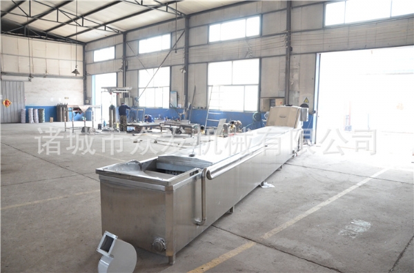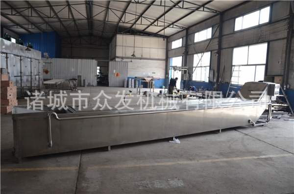 灭菌系统由槽体、输送装置、网压装置及加热系统组成。槽体由内胆、框架、保温材料、外包皮、箱盖、循环泵部件进水接口、排污接口中、电热管、热电阻接口、溢流接口等部件组成。与水接触部分均采用不锈钢材料制造。输送装置由从轴、链轮、轴承座、网带、张紧装置等组成。网带材料均采用不锈钢制成。其余零件均采用黑色材料,经表面处理后涂上防腐油漆。网压装置由两侧固定架,张紧装置、轴承座、主从动轴、链轮链条、网带等组成。除轴承座、链轮外,均采用不锈钢制造而成。加热系统电加热、加热管、热电阻、温控仪管件组成,槽内加热管采用不锈钢制造。